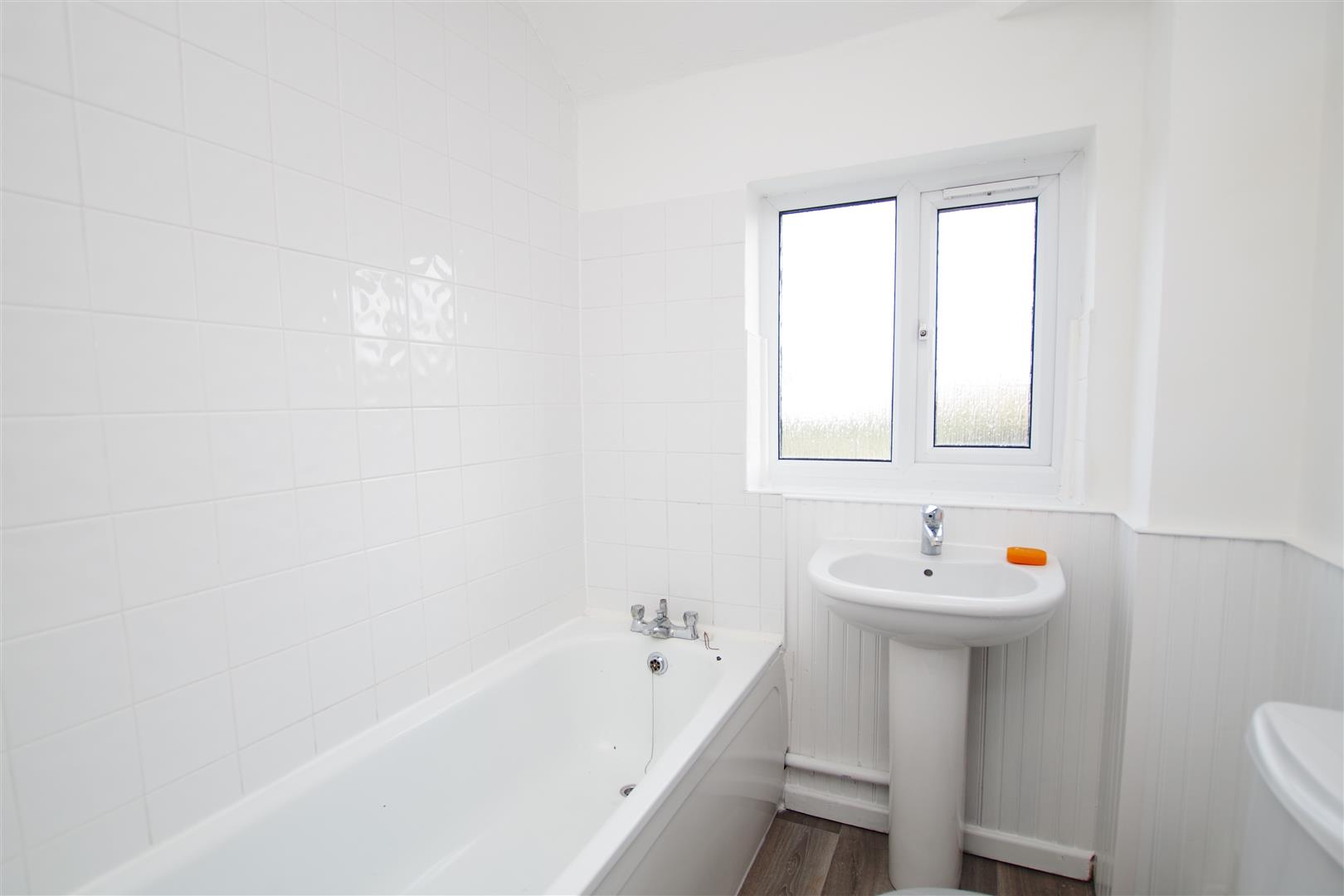 Obscured uPVC window to rear elevation. White suite comprising of panelled bath, pedestal wash hand basin and low level W.C. Part tiled walls. Tiled flooring. Radiator.