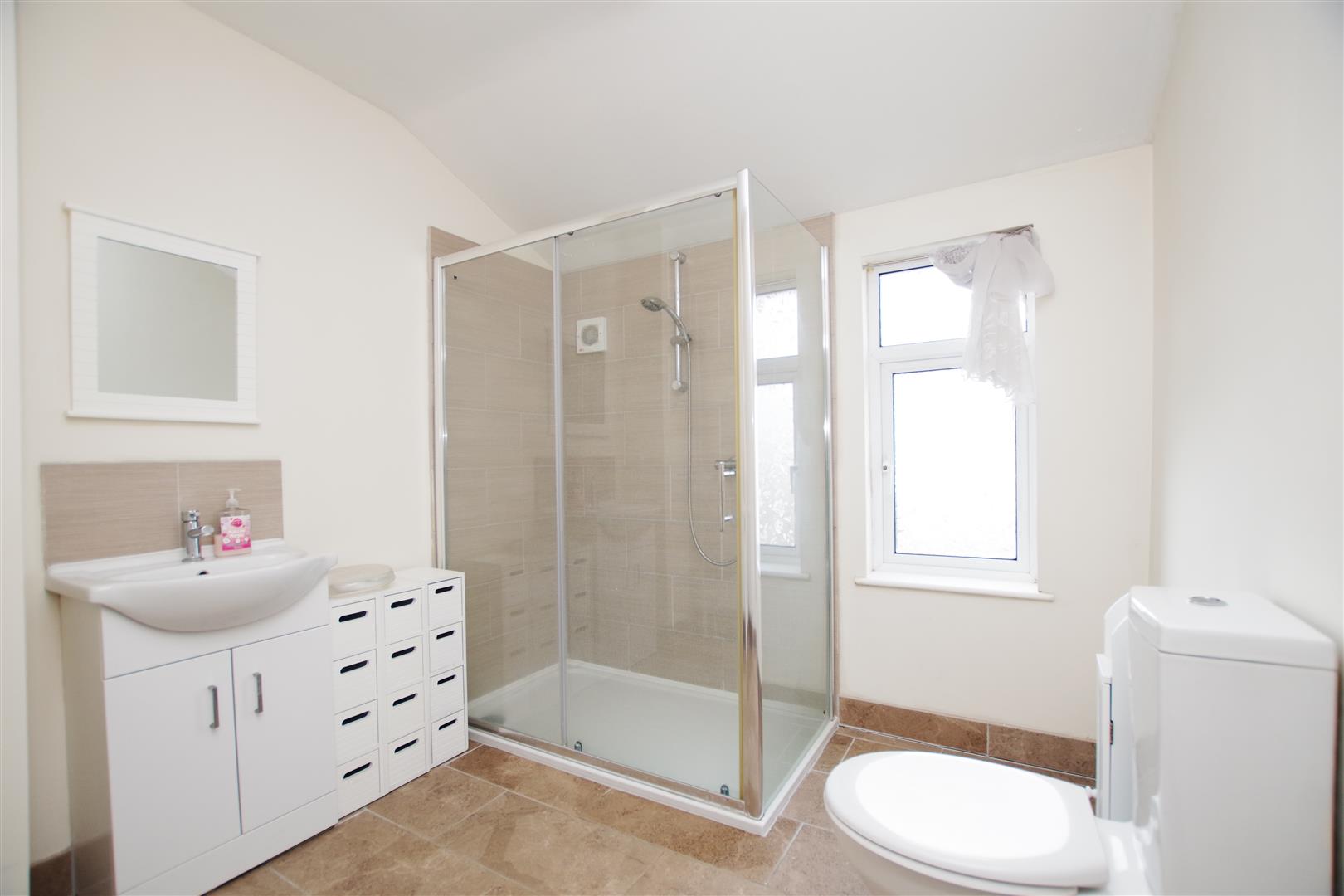 Obscured uPVC window to rear elevation. Walk in double shower, wash hand basin with cupboard under and low level W.C. Extractor fan. Part tiled walls. Vinyl flooring. Radiator. Heated towel rail.