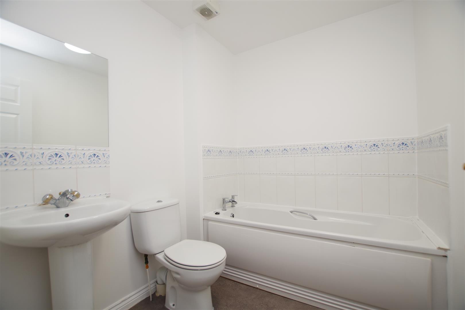 White suite comprising of panelled bath, pedestal wash hand basin with splash back tiles and low level W.C. Extractor. Part tiled walls. Vinyl flooring. Radiator.