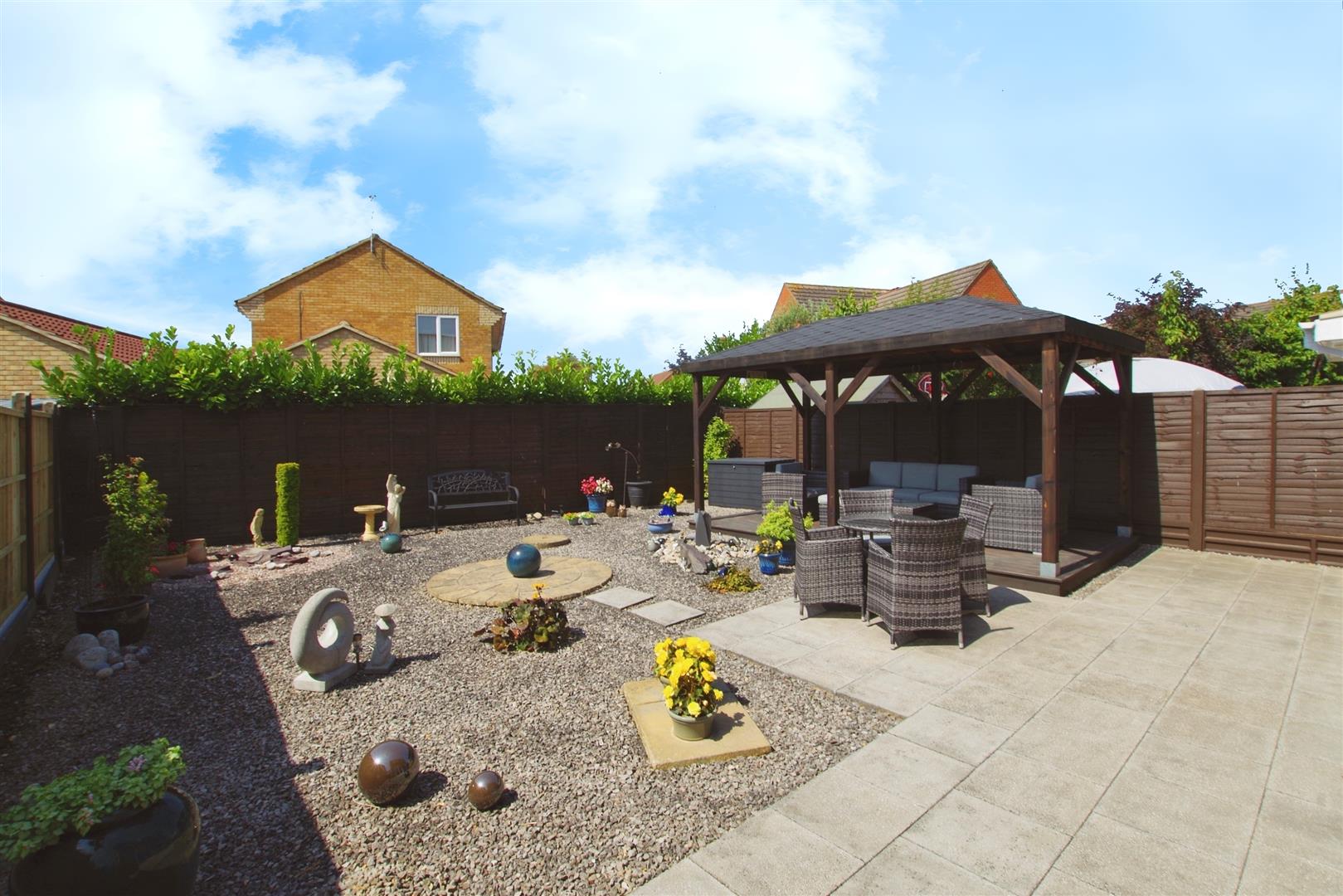 West facing. Enclosed by timber fencing. Mostly gravelled with water features. Paved patio. Decking area with Pergola. Pedestrian access to garage. Gated access to front. Outside tap.
