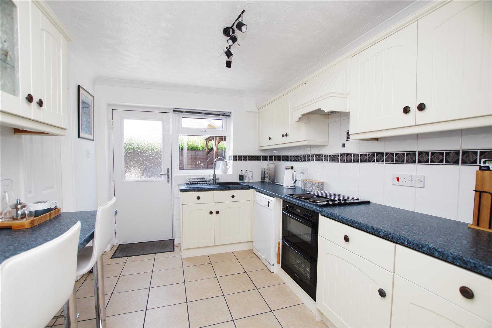 uPVC window and composite door to rear garden. Matching wall and base units with rolled edge worktops over. Breakfast bar. Acrylic sink and drainer. Built in double oven. Electric hob with extractor hood over. Integral fridge and freezer. Space and plumbing for dishwasher. Part tiled walls. Tiled flooring. Radiator.
