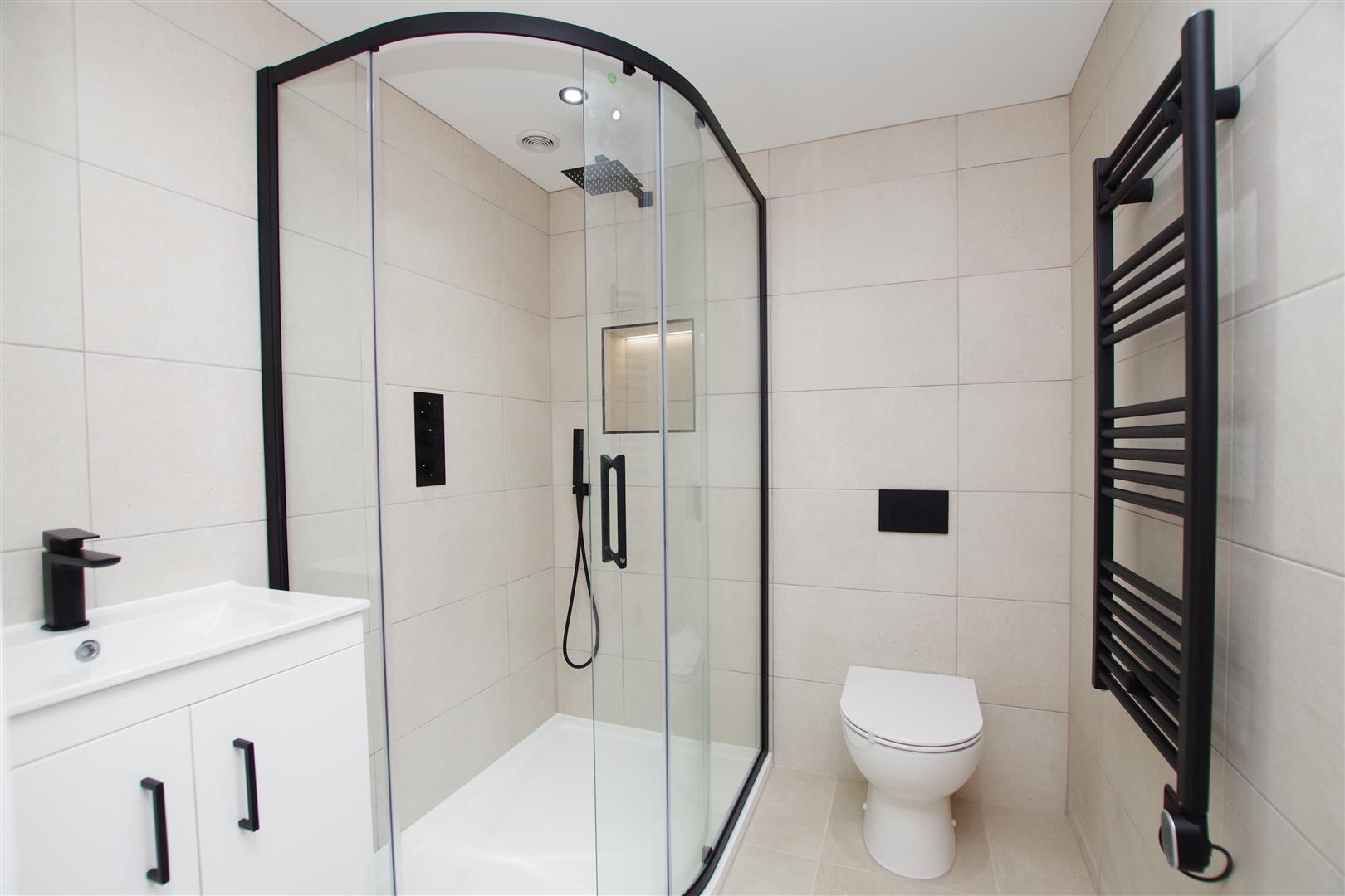 Obscured uPVC window to front elevation. White suite comprising of built in double shower, wash hand basin with cupboard under and low level W.C. Extractor fan. Fully tiled walls. Tiled flooring. Heated towel rail.