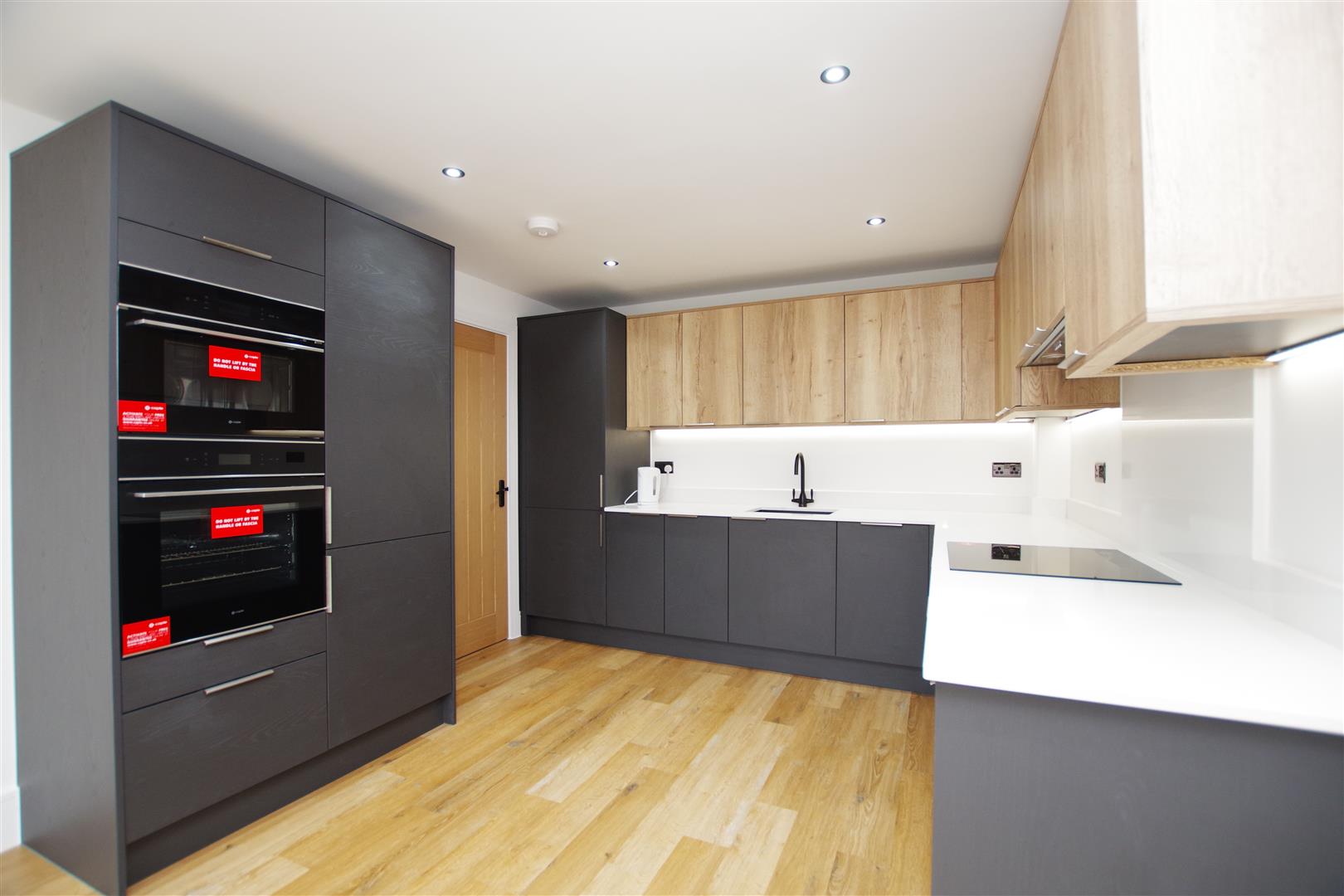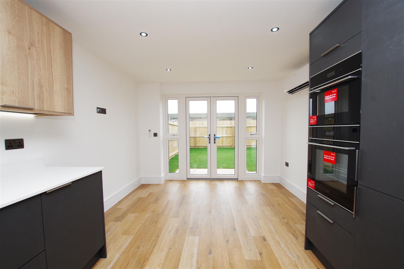 uPVC patio doors and windows to rear garden. Wall and base units with Quartz worktops over. Sink and drainer. Built in double oven. Induction hob with extractor hood over. Integral dishwasher and fridge/freezer. LVT flooring. Inset ceiling lights. Wall mounted heating and air con system.
