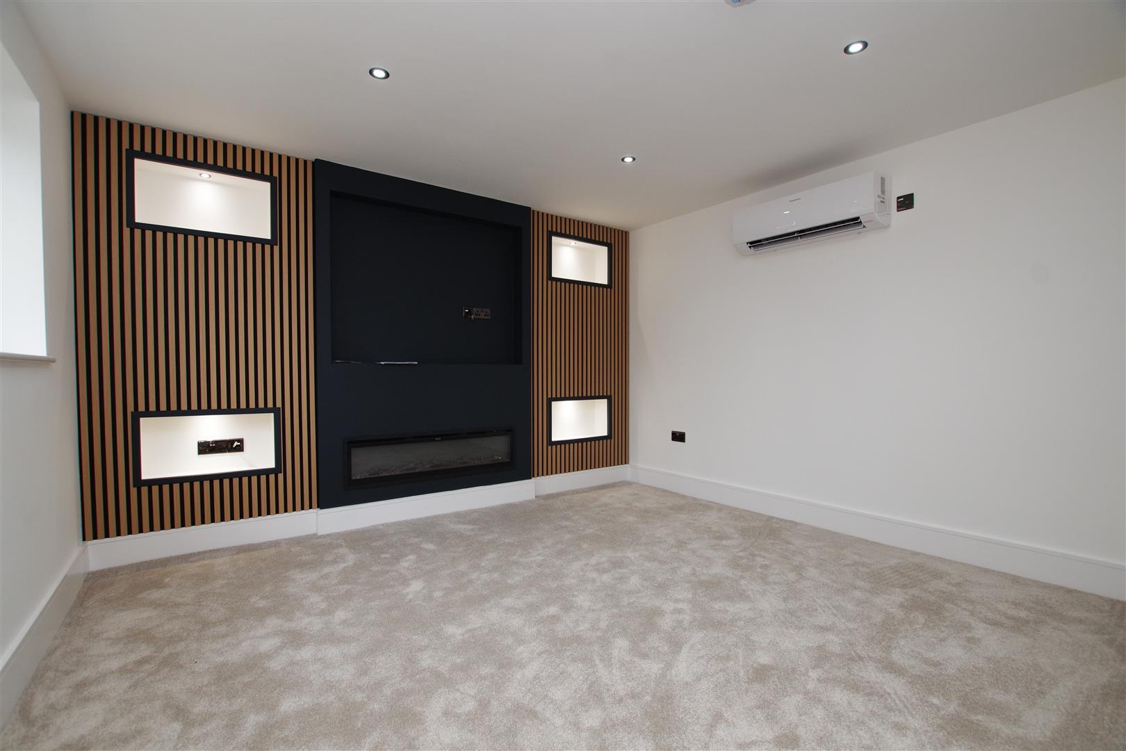 uPVC window to front elevation. Media wall with built in electric fire. Inset ceiling lights. Wall mounted heating and air con system.