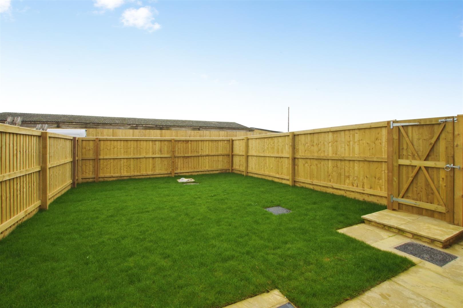 South facing. Enclosed by timber fencing. Mostly laid to lawn with patio area. Gated access to parking and front.
