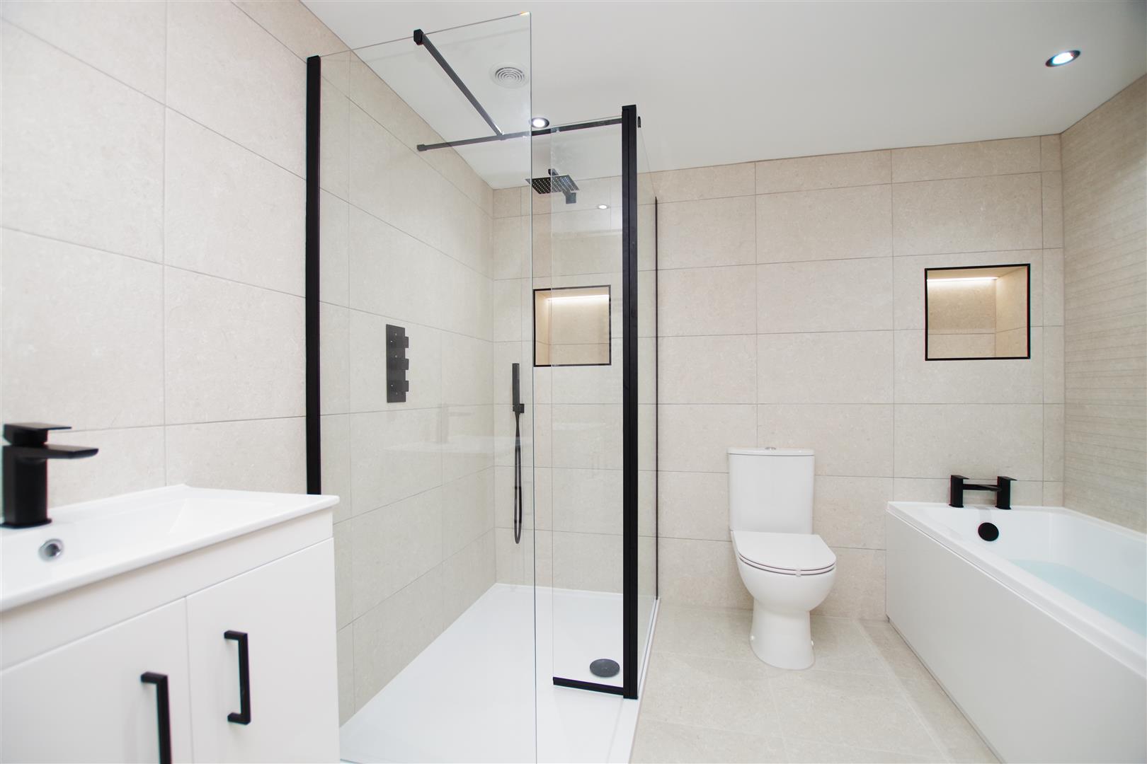 White suite comprising of panelled bath, walk in double shower, wash hand basin with cupboard under and low level W.C. Fully tiled walls. Tiled flooring. Extractor fan. Inset ceiling lights. Heated towel rail.