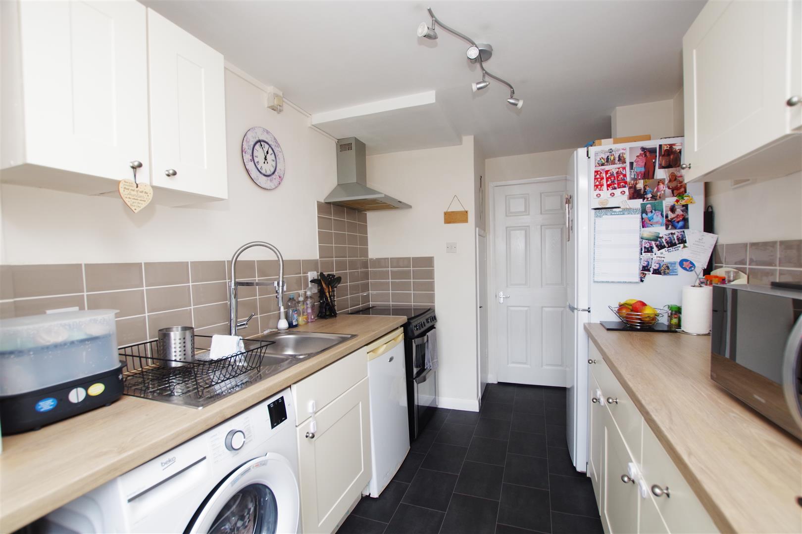 uPVC door and window to rear elevation. Wall and base units with rolled edge worktops over. Stainless steel sink and drainer with half bowl. Freestanding cooker with extractor hood over. Space and plumbing for dishwasher, washing machine and tumble dryer. Understairs cupboard. Part tiled walls. Vinyl flooring.