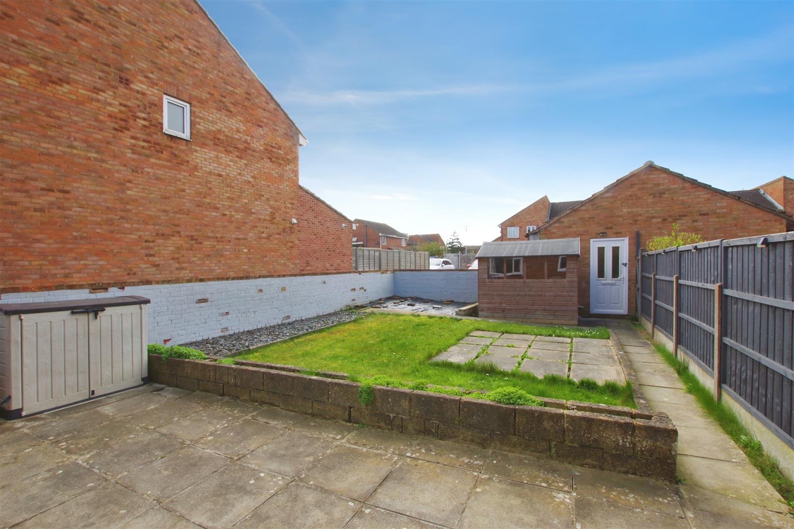 South West facing. Enclosed by brick wall and timber fencing. Paved patio with path leading to gated rear access and garage. Laid to lawn with space for timber shed. Awning.