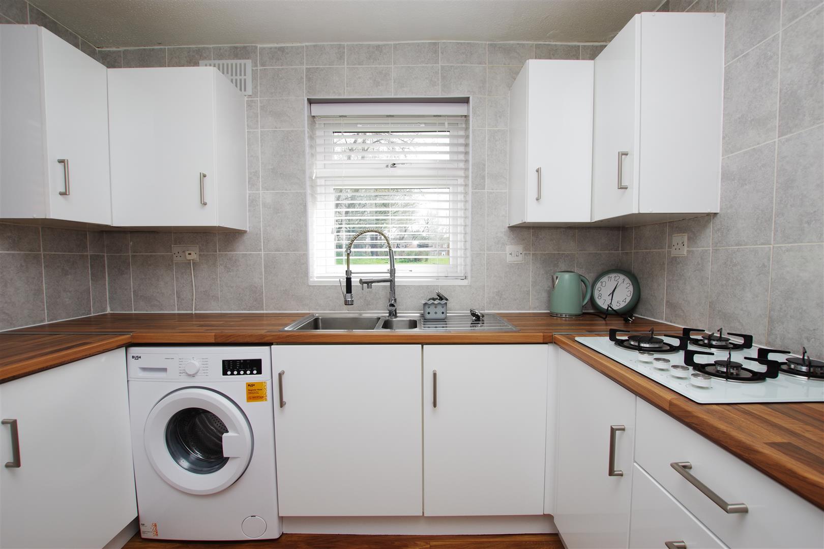uPVC windows to front and side elevation. White gloss wall and base units with rolled edge worktops over. Stainless steel sink and drainer with half bowl. Built in single oven. Gas hob. Space and plumbing for washing machine. Space for fridge/freezer. Part tiled walls. Laminate flooring.
