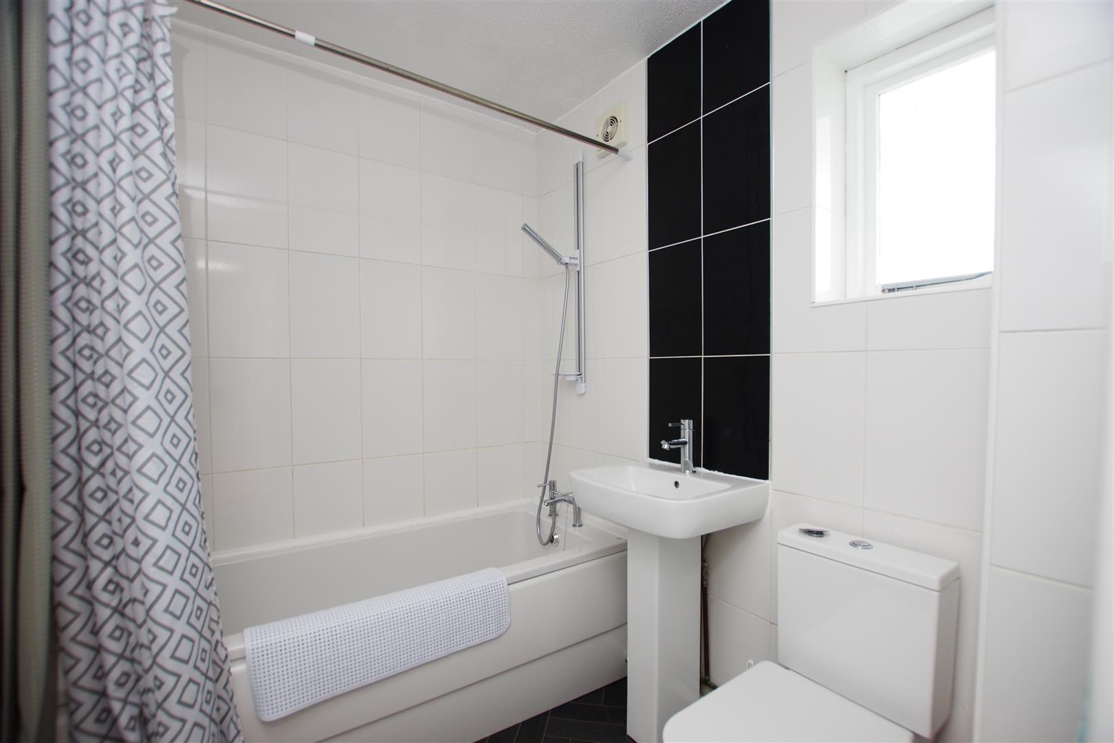 Obscured uPVC window to side elevation. White suite comprising of panelled bath with shower over, pedestal wash hand basin and low level W.C. Storage cupboard. Extractor fan. Fully tiled walls. Vinyl flooring. Heated towel rail.