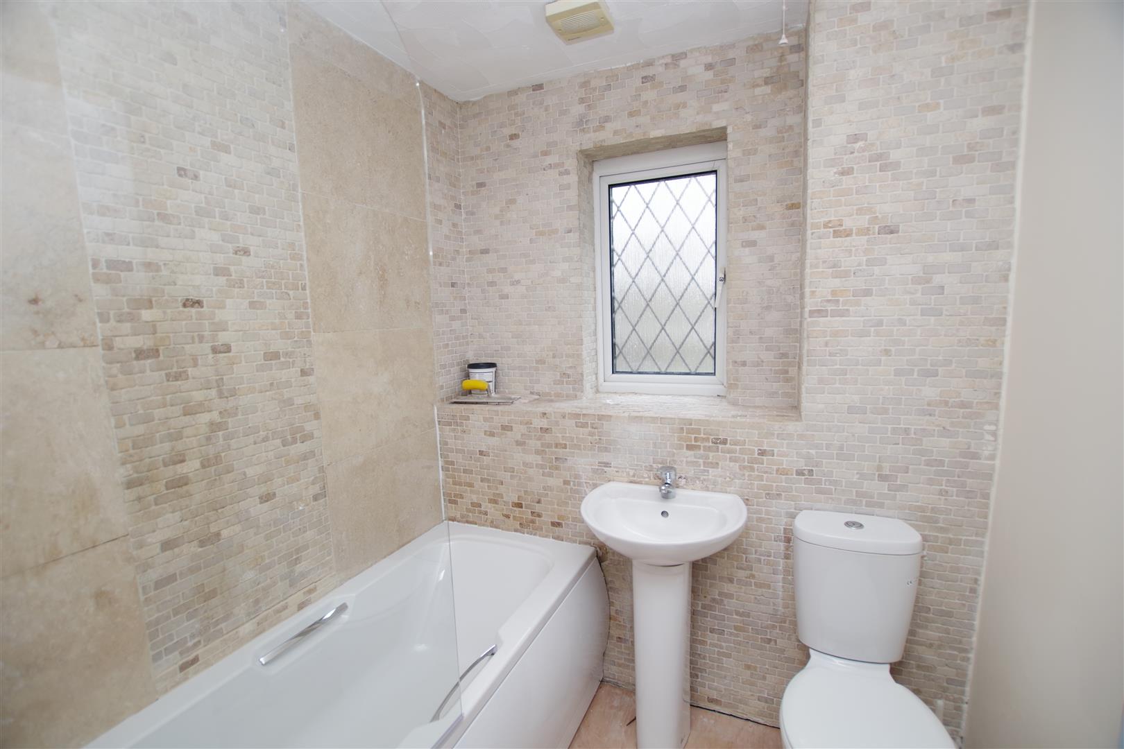 Obscured uPVC window to rear elevation. White suite comprising of panelled bath with shower over, pedestal wash hand basin and low level W.C. Extractor fan. Shaving point. Part tiled walls. Laminate flooring. Heated towel rail.