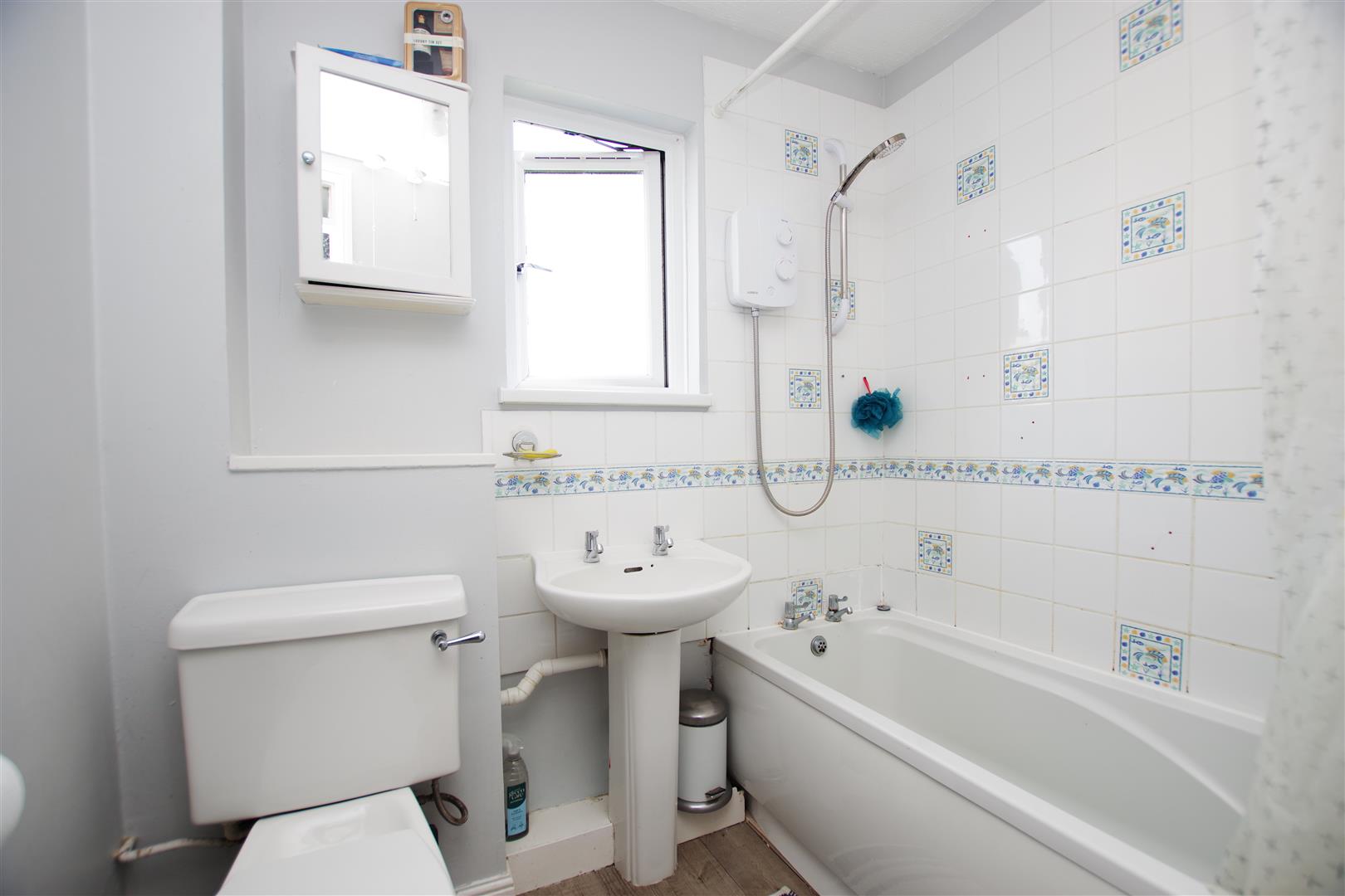 Obscured uPVC window to side elevation. White suite comprising of panelled bath with electric shower over, pedestal wash hand basin and low level W.C. Part tiled walls. LVT flooring.