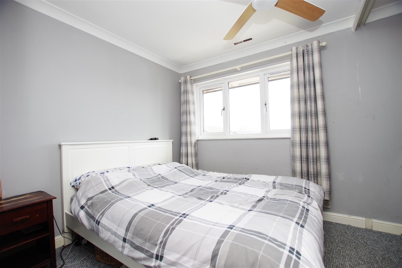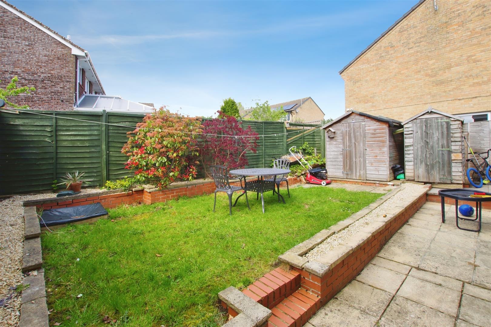 Enclosed by timber fencing. Paved patio. Lawned area with raised brick shrubs. Timber shed. Access to front. Outside socket and tap.