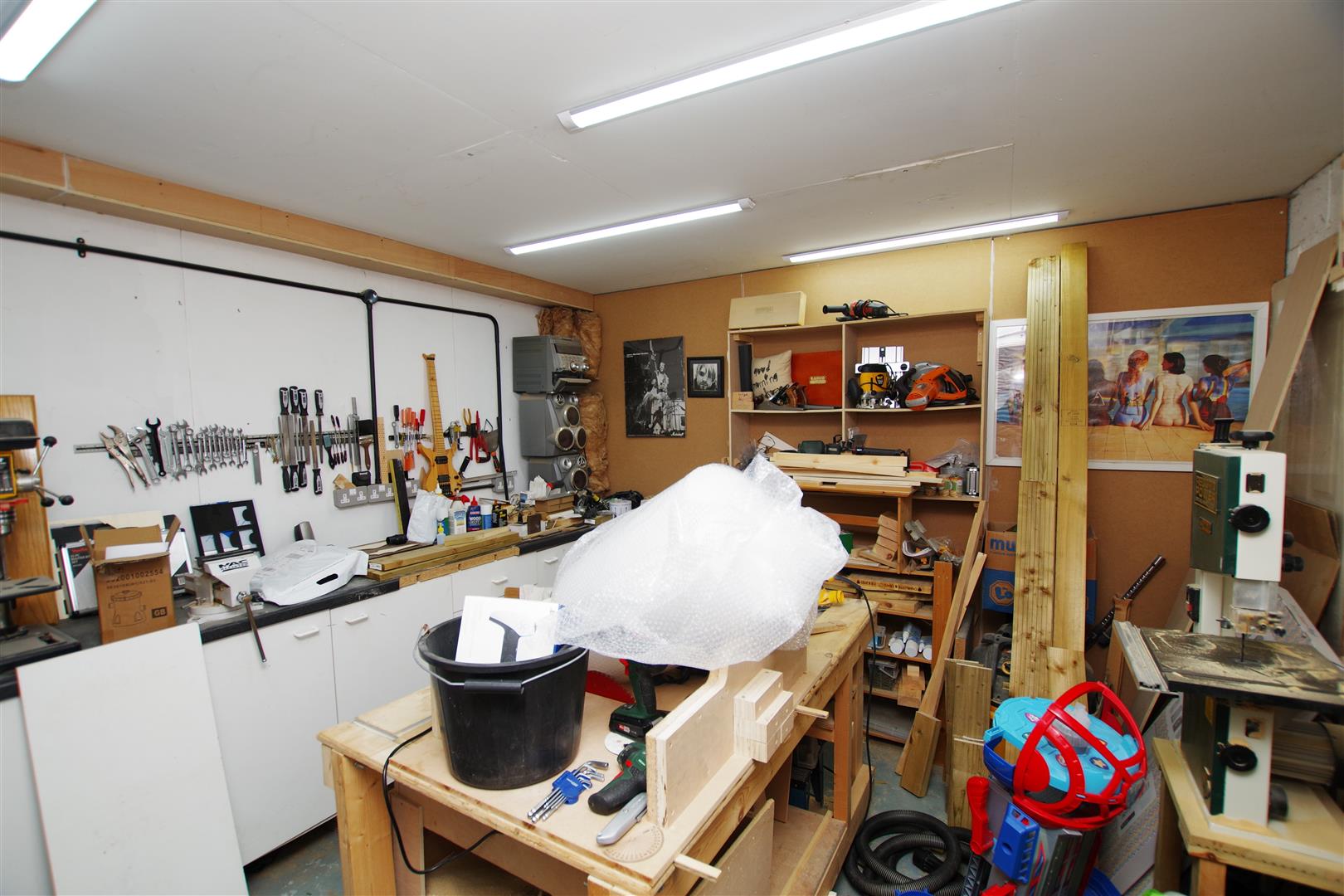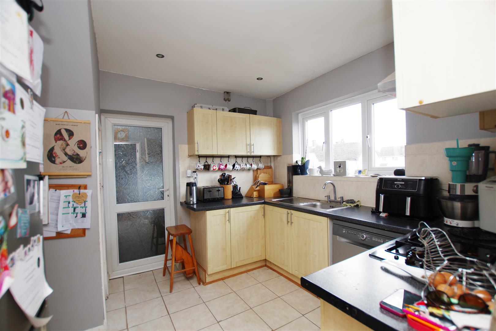 uPVC door to rear garden. Wall and base units with rolled edge worktops over. Space and plumbing for washing machine and tumble dryer. Vinyl flooring. Inset ceiling lights.