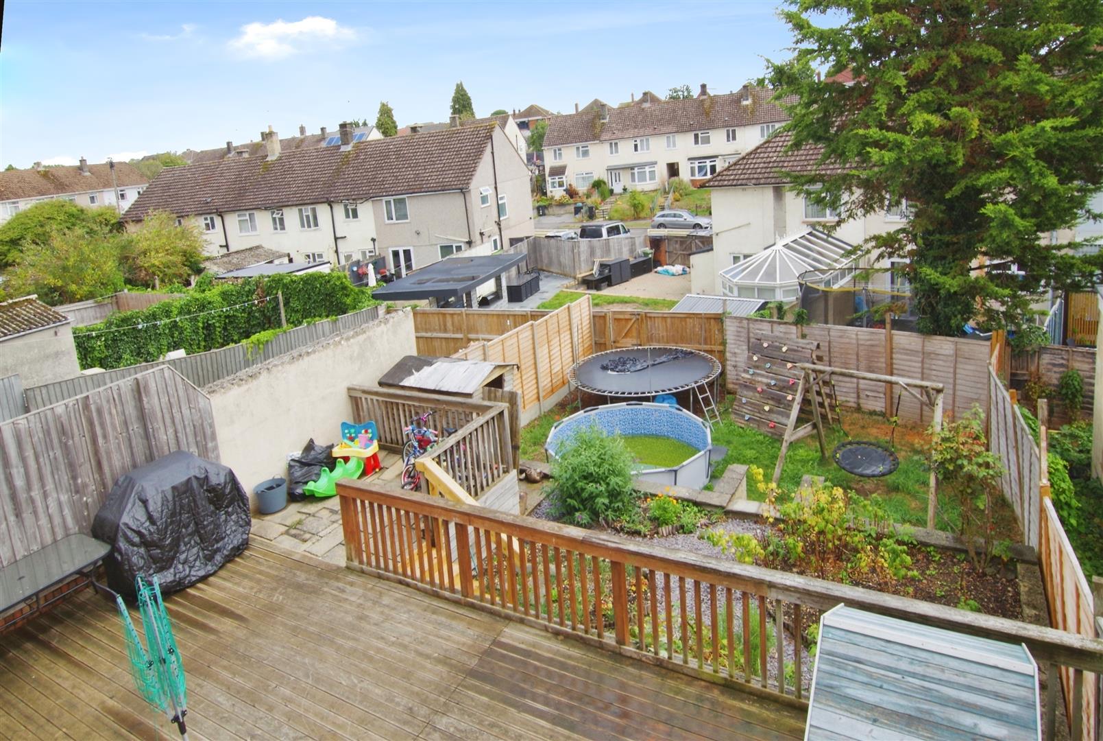 East facing. Enclosed by timber fencing. Large decking area with steps leading to low maintenance area with shrub borders and space for timber shed, further steps leading to lawned area.