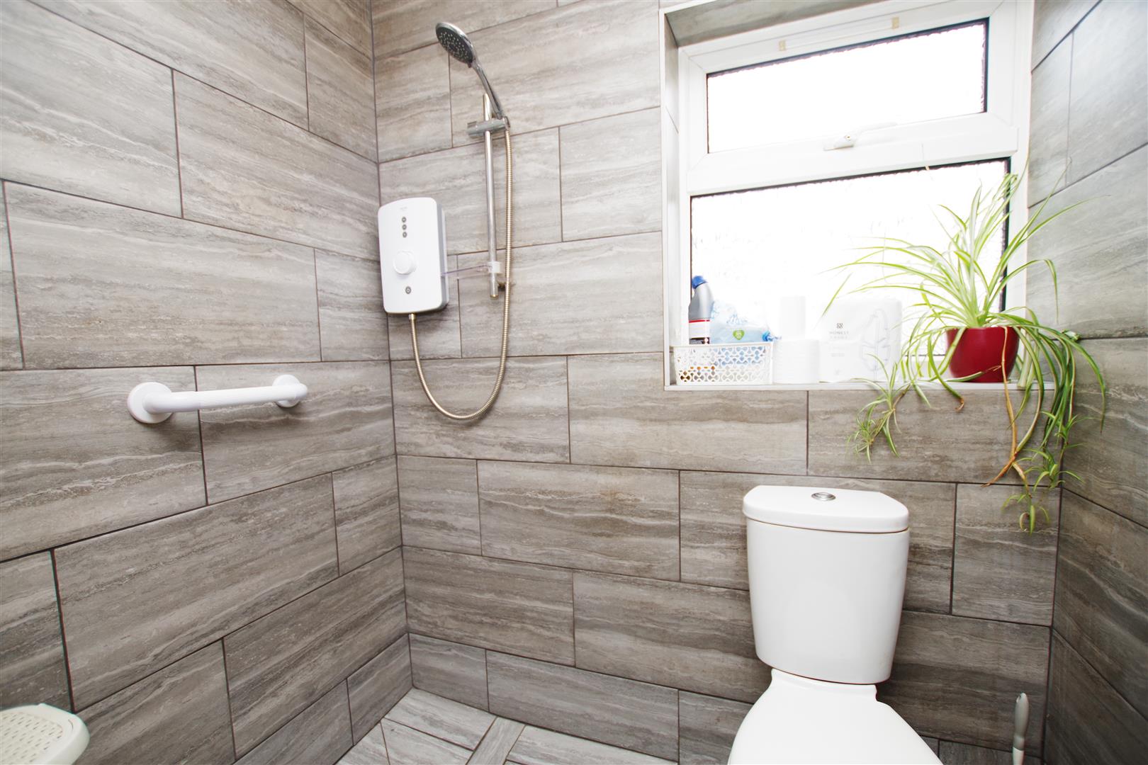 Obscured uPVC window to rear elevation. White suite comprising of electric shower, wash hand basin and low level W.C. Extractor fan. Fully tiled walls. Tiled flooring. Radiator.
