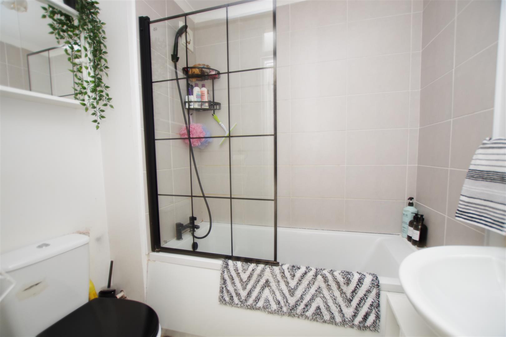 White suite comprising of panelled bath with shower over, pedestal wash hand basin and low level W.C. Extractor fan. Shaving light. Part tiled walls. Tiled flooring. Radiator.