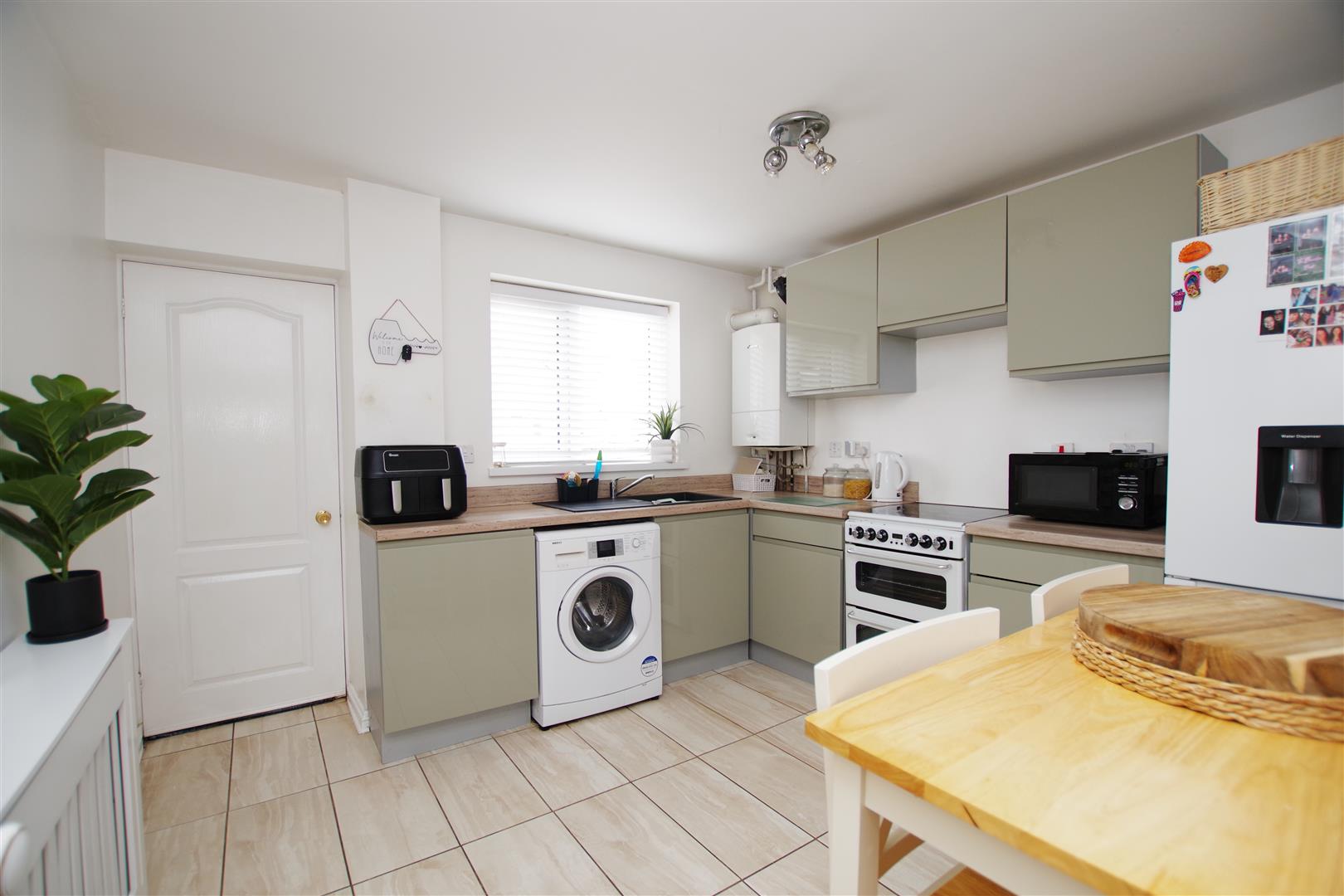 uPVC window to front elevation. Matching wall and base units with rolled edge worktops over. Acrylic sink and drainer. Freestanding cooker. Space and plumbing for washing machine. Space for fridge/freezer. Tiled flooring. Radiator.