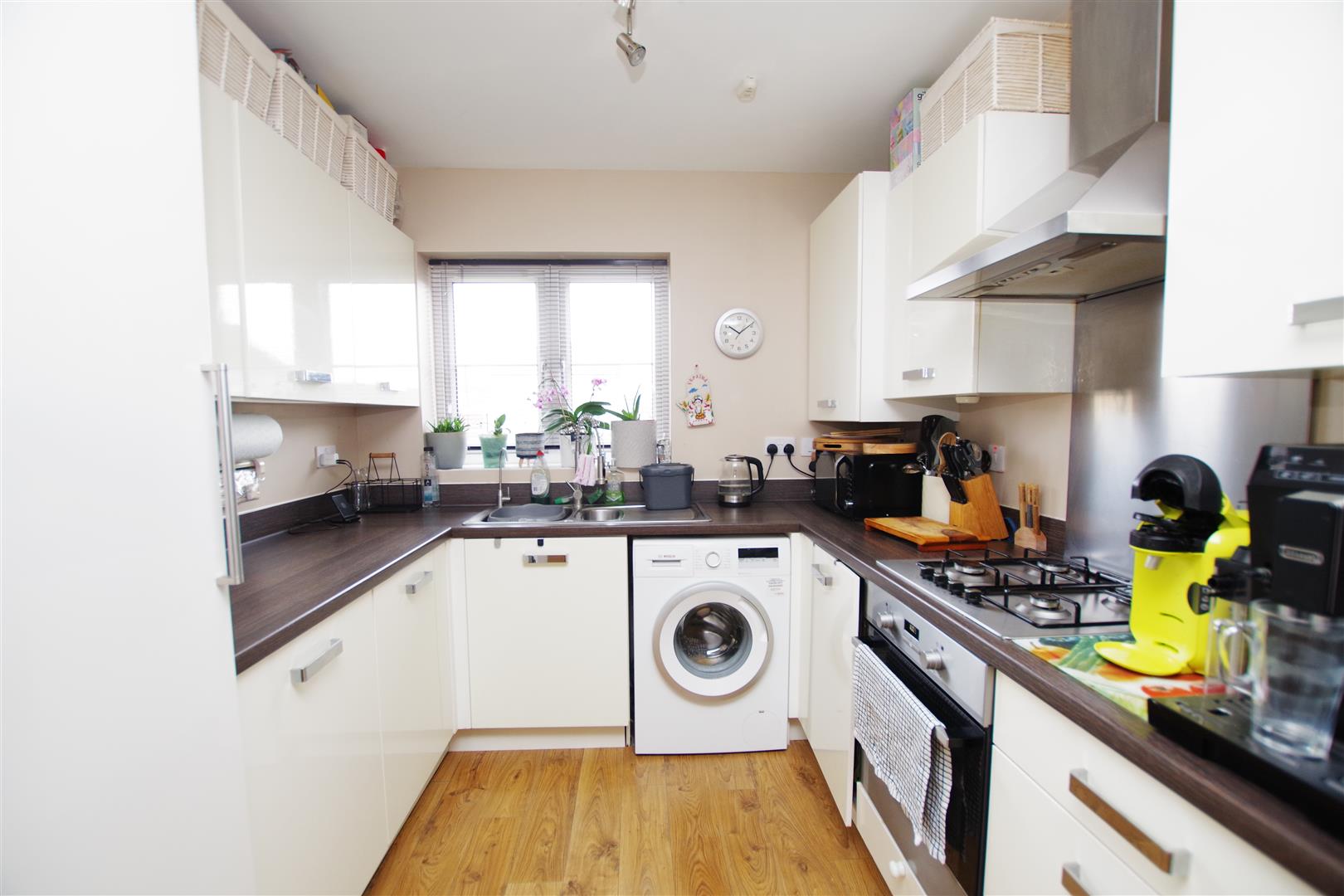 uPVC window to side and front elevation. Gloss wall and base units with rolled edge worktops over. Stainless sink and drainer with half bowl. Built in single oven. Gas hob with extractor hood over. Integral dishwasher. Space and plumbing for washing machine. Space for fridge/freezer. Wood flooring. Radiator.