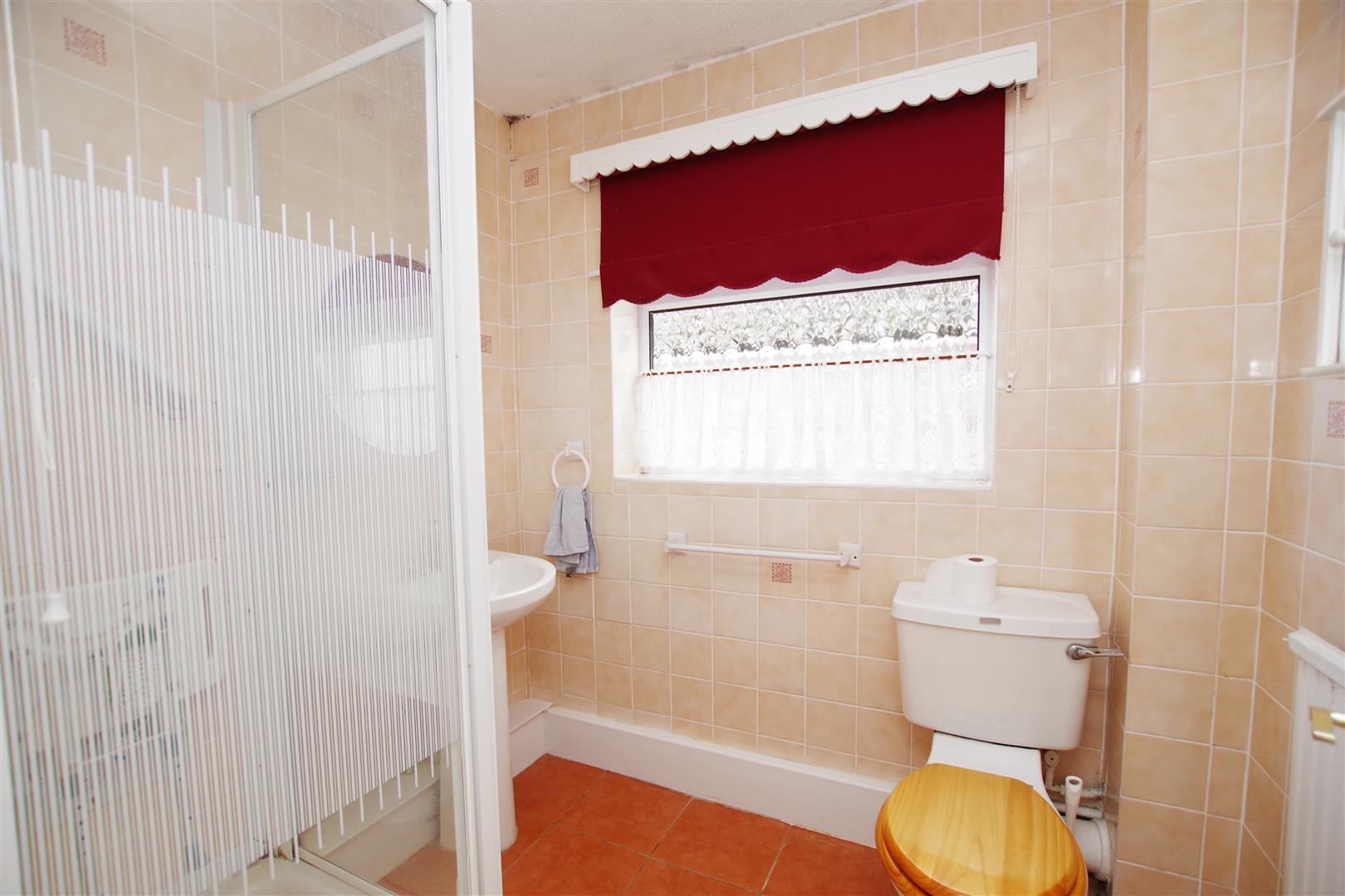 Obscured uPVC window to side elevation. White suite comprising of built in shower, pedestal wash hand basin and low level W.C. Extractor fan. Fully tiled walls. Tiled flooring. Radiator.