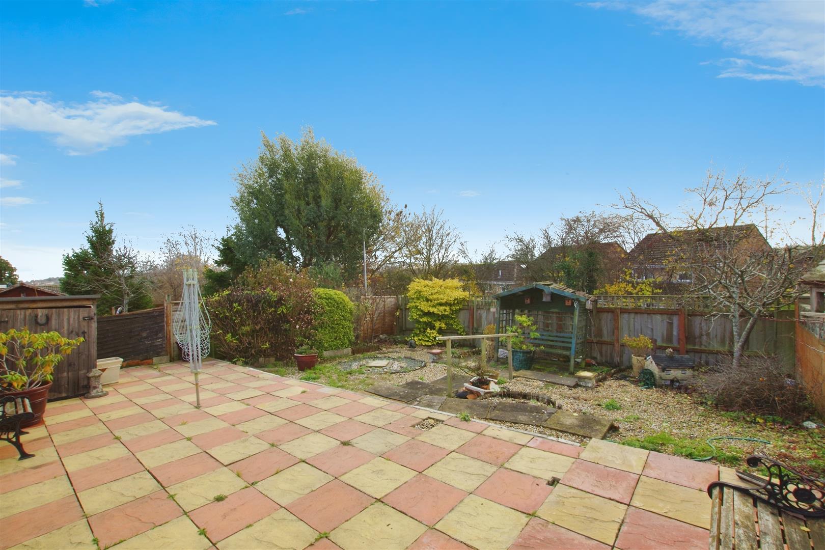 South facing. Enclosed by timber fencing and wall. Large paved patio with steps leading to gravelled area with shrub borders and mature hedging. Gated access to front.