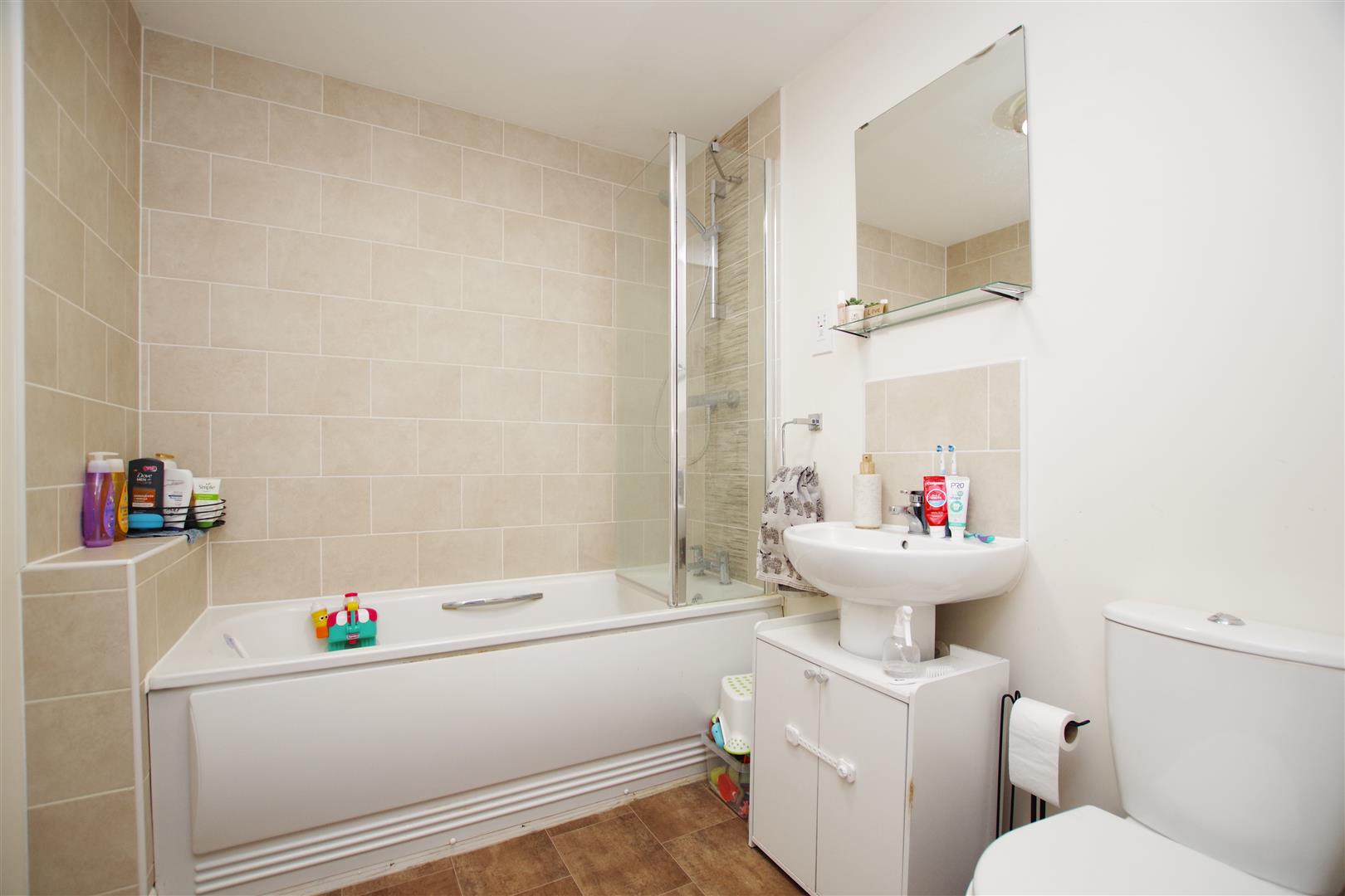 White suite comprising of panelled bath with shower over, pedestal wash hand basin and low level W.C. Extractor fan. Shaving point. Part tiled walls. LVT flooring. Heated towel rail.