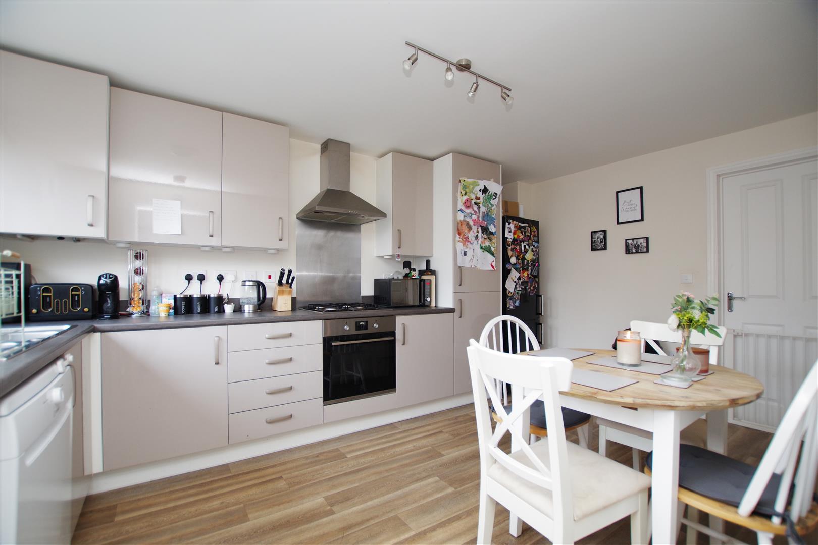 uPVC window to rear elevation. Gloss wall and base units with rolled edge worktops over. Stainless steel sink and drainer with half bowl. Built in single oven. Gas hob with extractor hood over. Space and plumbing for washing machine and dishwasher. Space for fridge/freezer. Understairs cupboard. LVT flooring. Radiator.