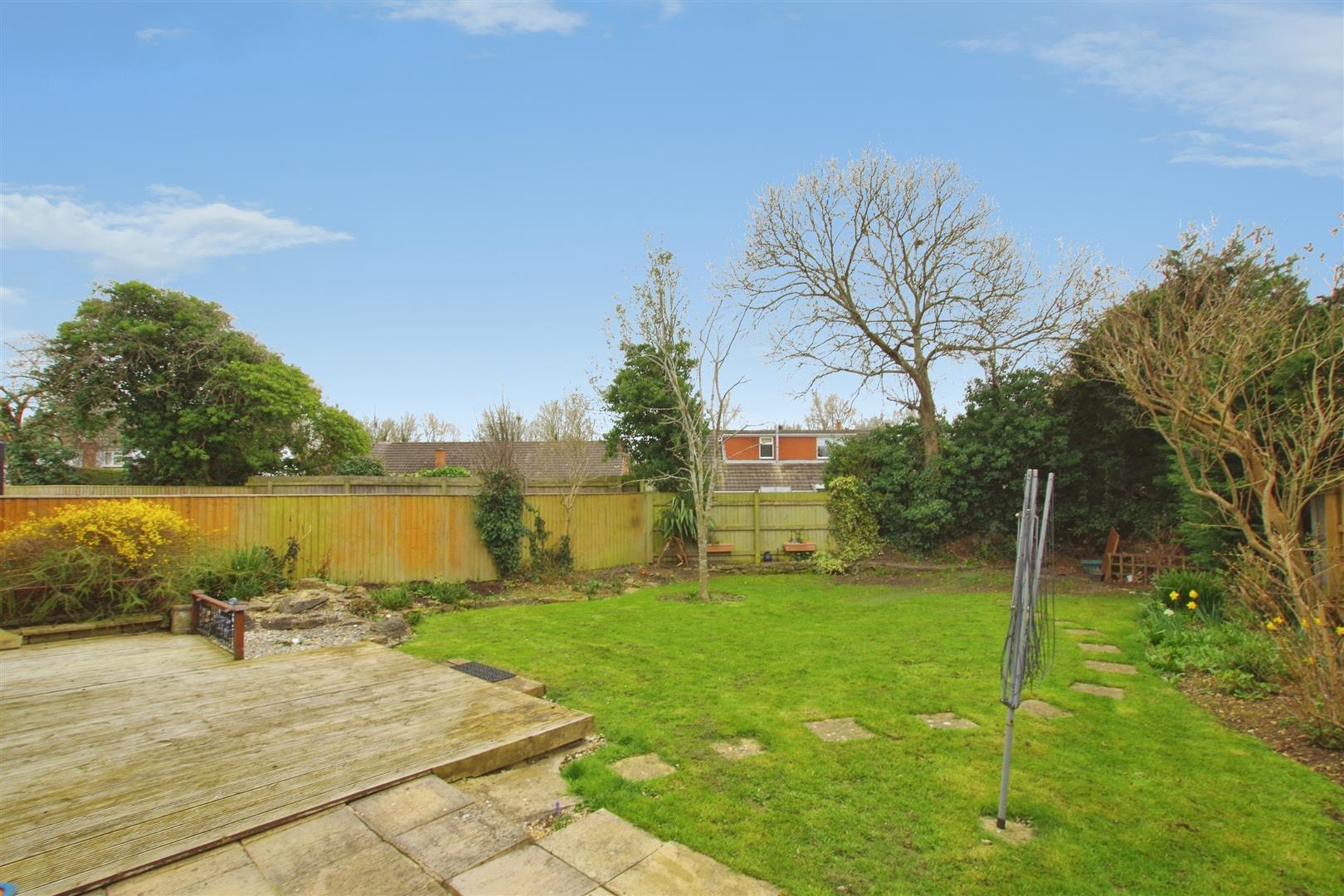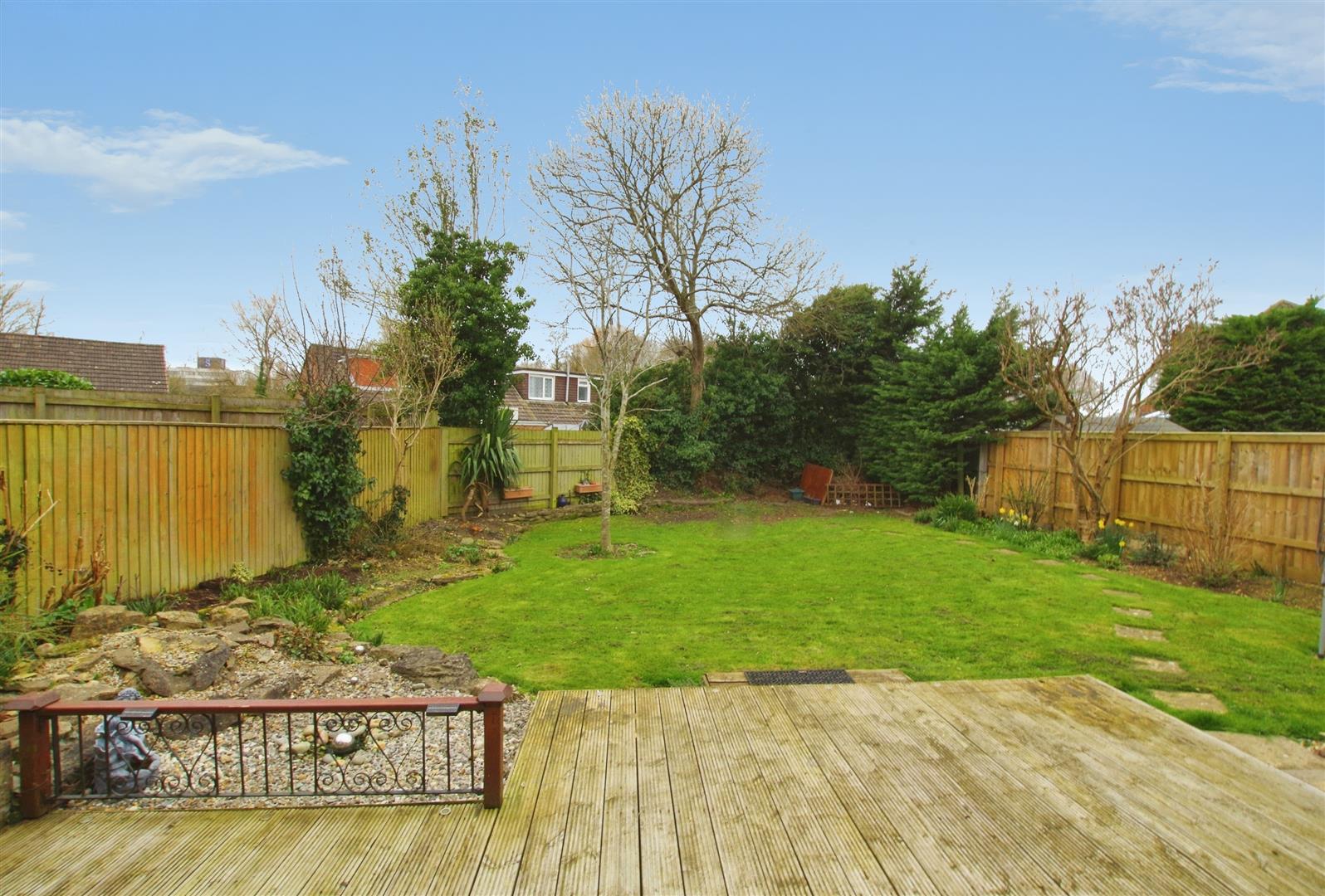 Enclosed by timber fencing. Decking and paved patio. Mostly laid to lawn with mature shrubs and trees. Gated access to front.