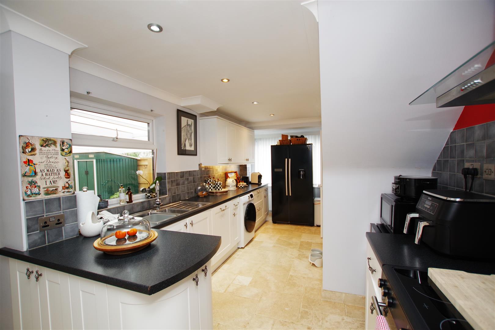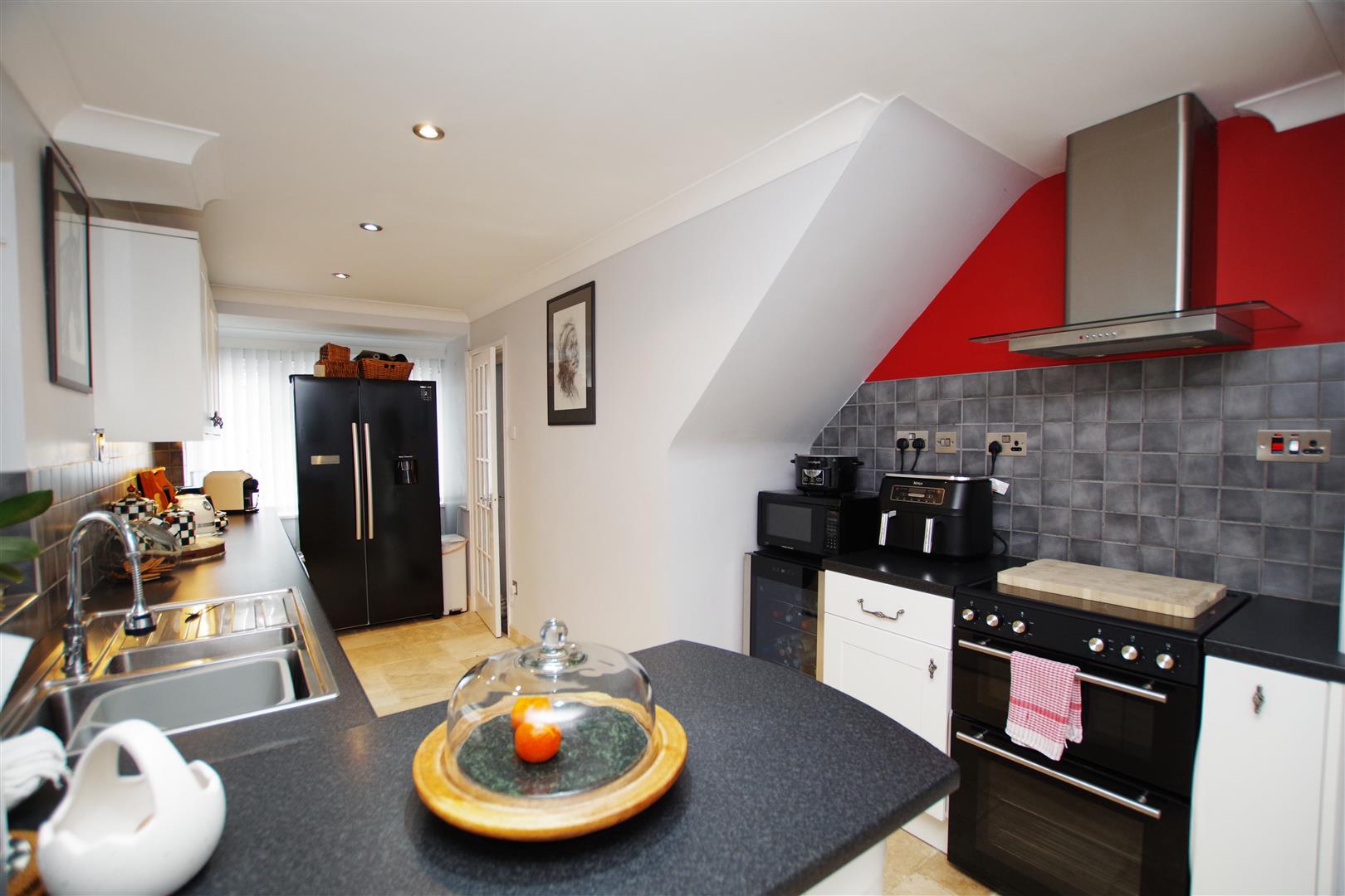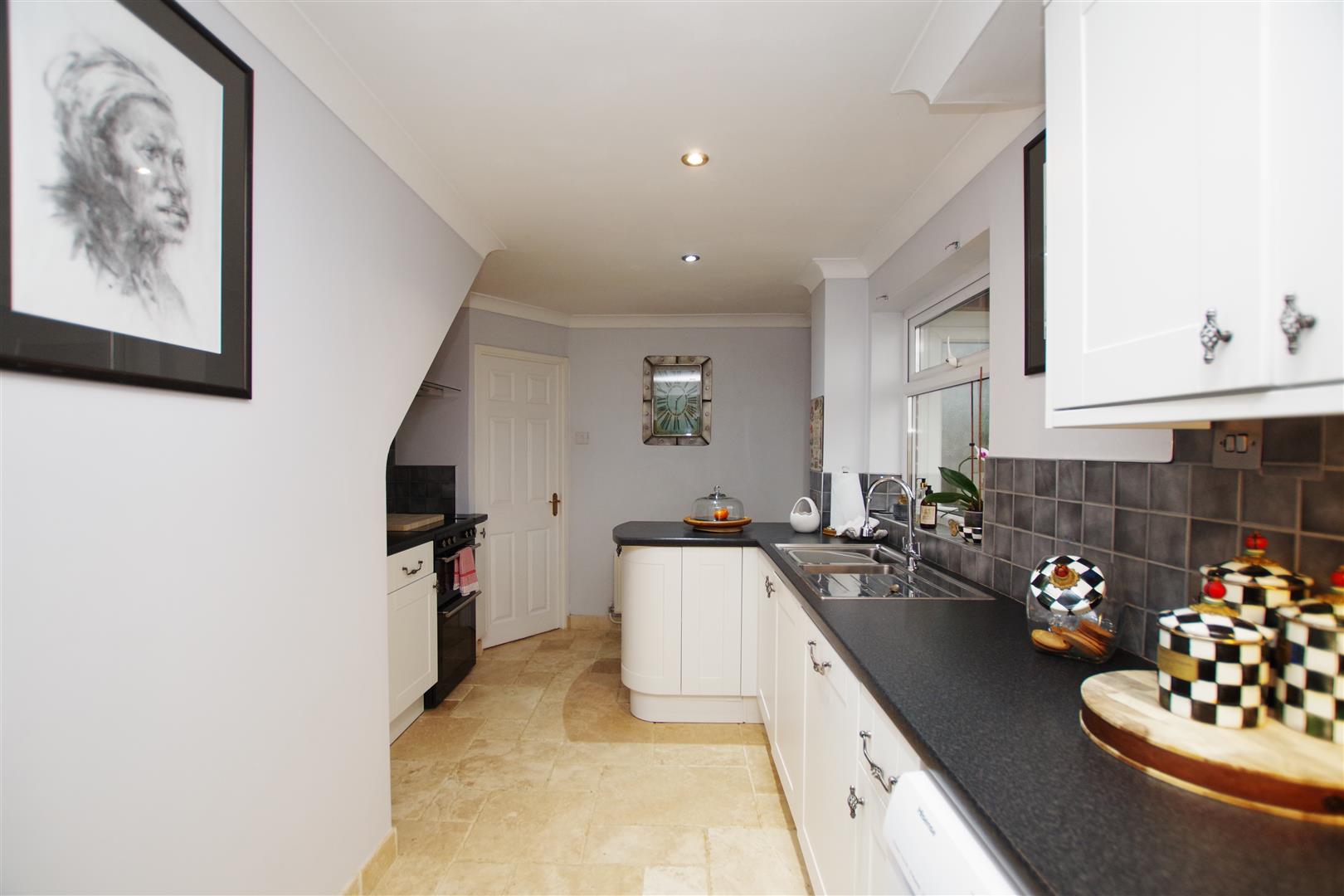 uPVC windows to front and side elevation. White wall and base units with rolled edge worktops over. Stainless steel sink and drainer with half bowl. Space for cooker with extractor hood over. Integral dishwasher. Space and plumbing for washing machine. Space for fridge/freezer. Part tiled walls. Stone floor. Inset ceiling lights. Two radiators.