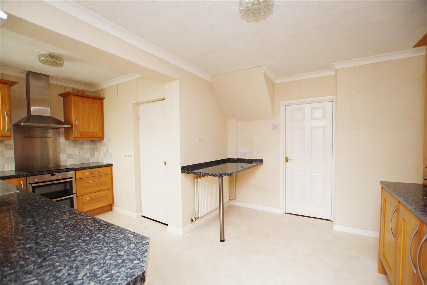 Door to sun room. Window to utility room. Wall and base units with rolled edge worktops over. Stainless steel sink and drainer with half bowl. Built in double oven. Ceramic hob with extractor hood over. Integral dishwasher and fridge. Part tiled walls. Vinyl flooring. Radiator.