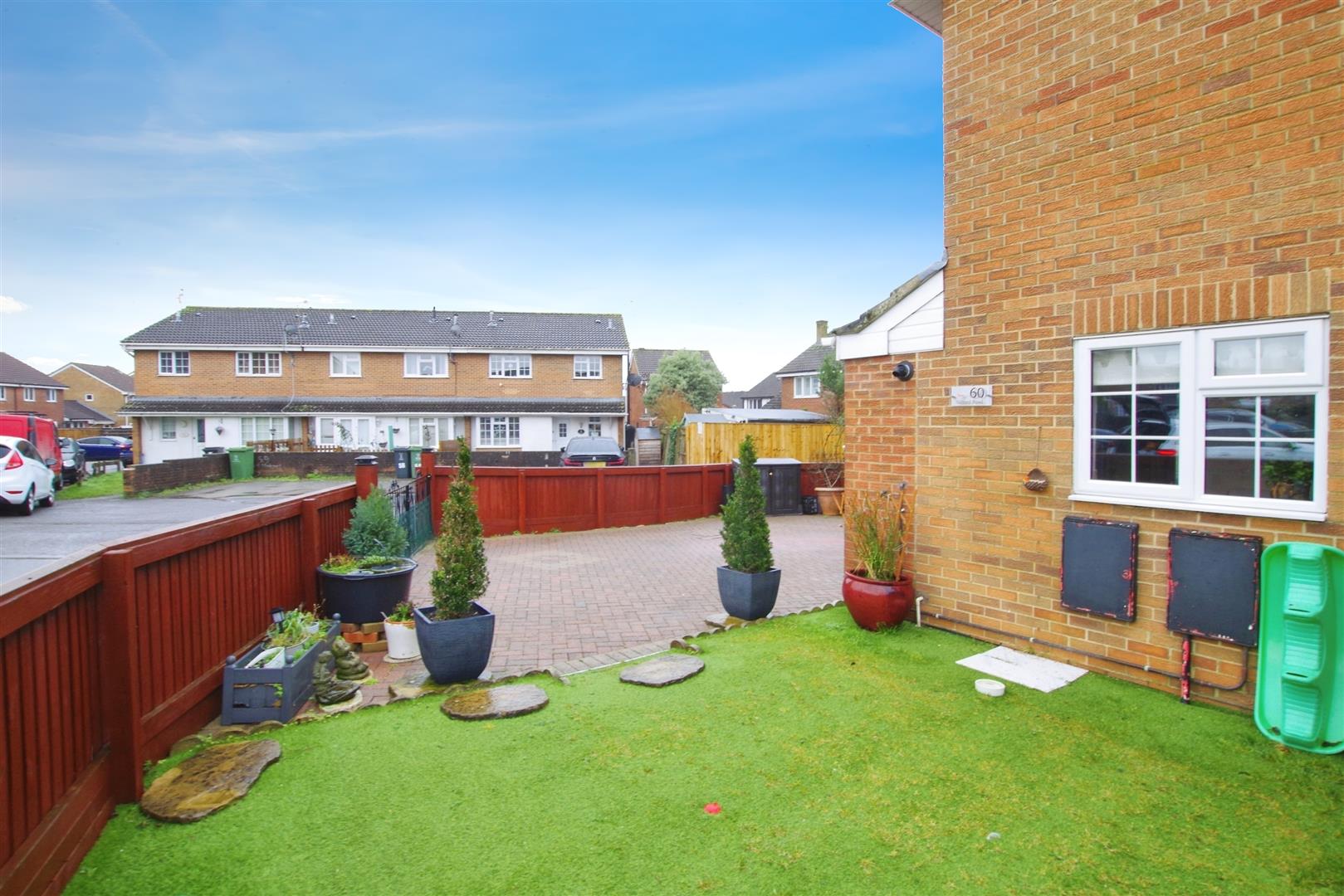 Enclosed by timber fencing with gated access. Block paved driveway with parking for two vehicles. Laid AstroTurf with timber shed. Outside light.