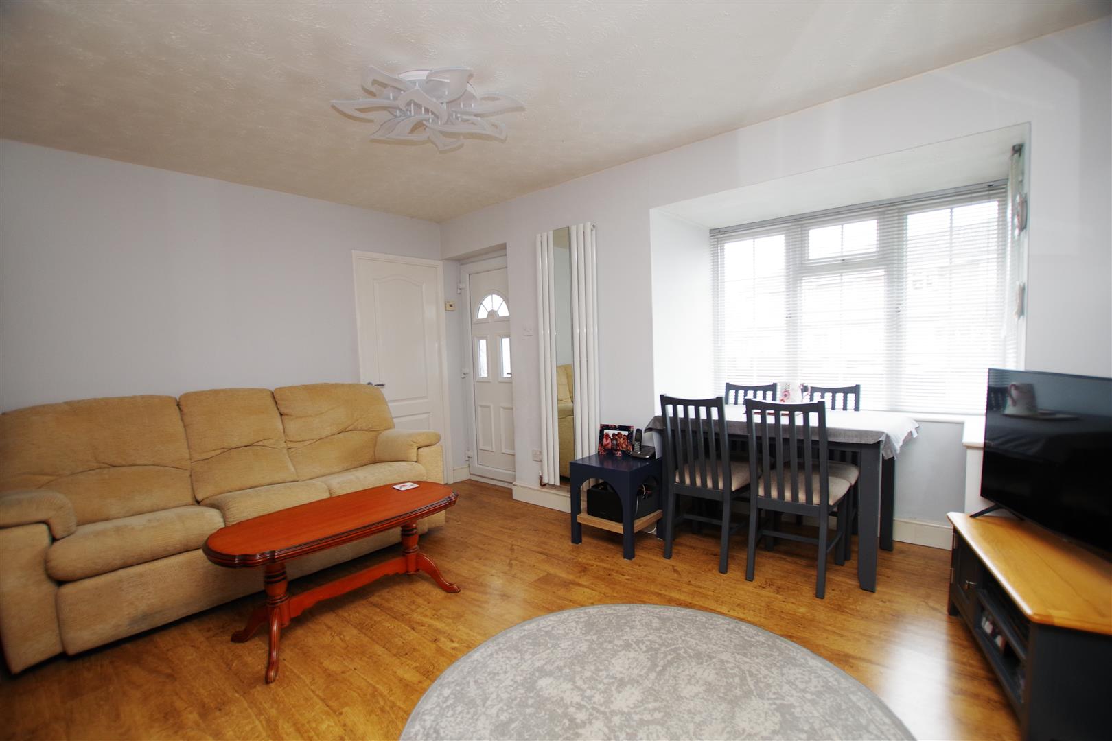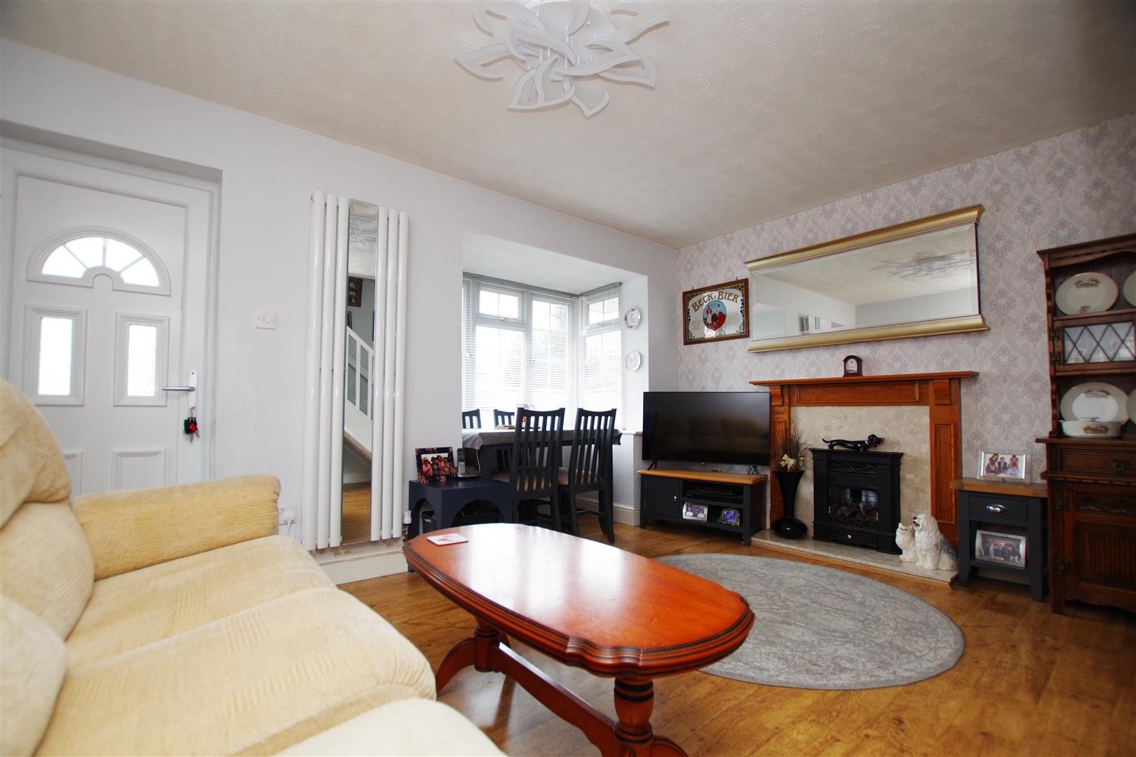 uPVC bay window to front elevation. Stairs to first floor. Gas fireplace with mantle over. Laminate flooring. Vertical radiator.