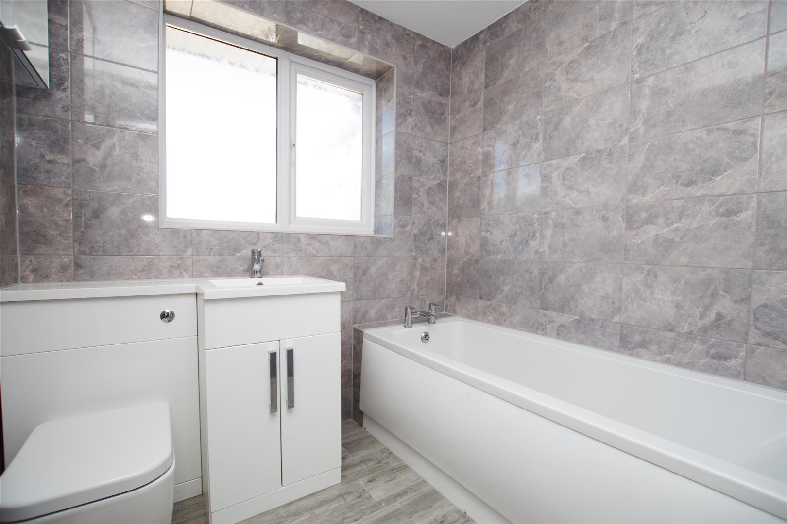Obscured uPVC window to rear elevation. White suite comprising of panelled bath, wash hand basin with cupboard under and built in W.C. Shaving point. Fully tiled walls. Tiled flooring. Inset ceiling lights. Heated towel rail.