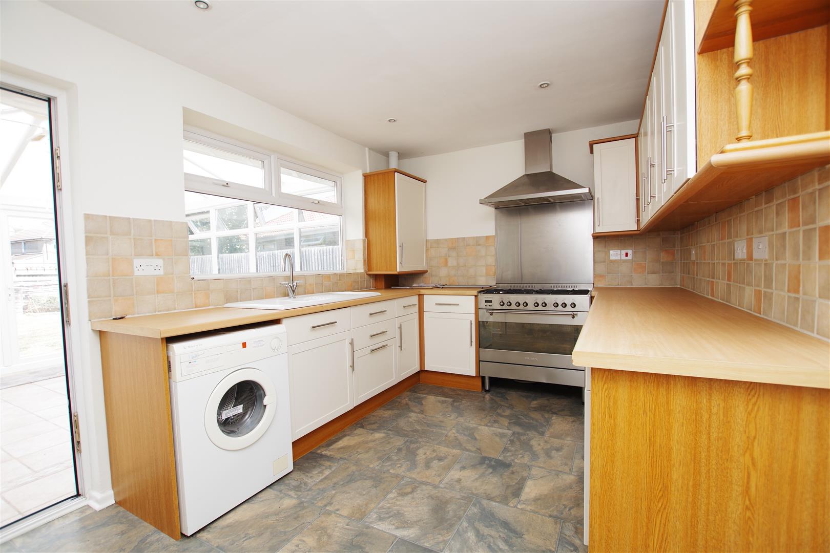 uPVC window and door to conservatory. Matching wall and base units with rolled edge worktops over. Ceramic sink and drainer with half bowl. Freestanding Range cooker with six gas burner and triple extractor hood over. Space and plumbing for washing machine. Integral fridge and freezer. Part tiled walls. Tile effect flooring. Inset ceiling lights. Radiator.