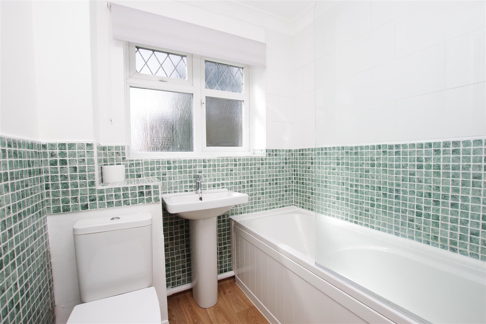 Obscured window to side elevation. White suite comprising of panelled bath with shower over, pedestal wash hand basin and low level W.C. Part tiled walls. Vinyl flooring. Loft access. Heated towel rail.