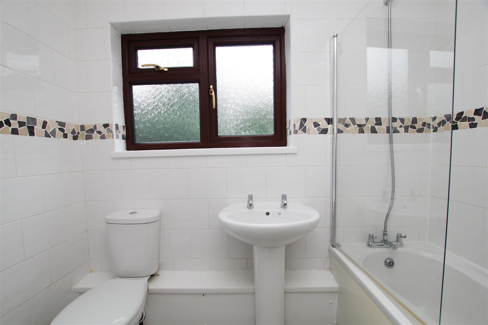 Obscured uPVC window to rear elevation. White suite comprising of panelled bath with shower over, pedestal wash hand basin and low level W.C. Extractor fan. Shaving point. Fully tiled walls. Tiled flooring. Heated towel rail.